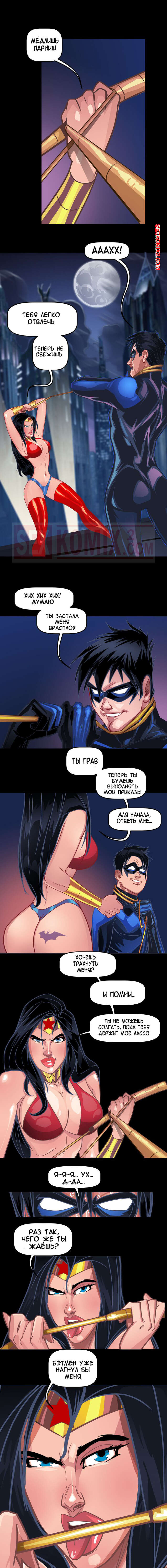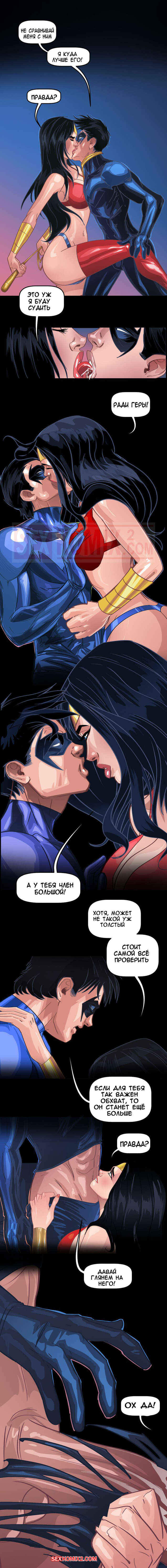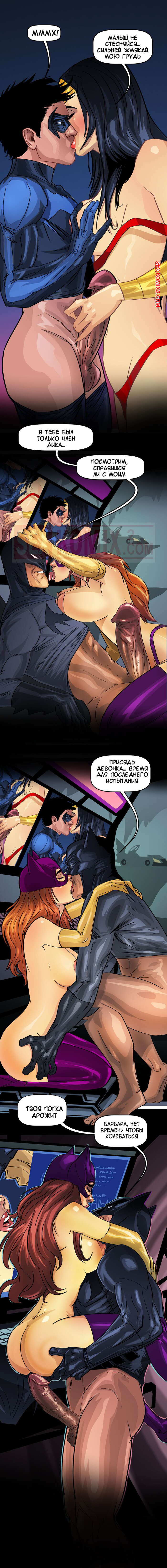 Порно комикс Лига Справедливости. Я хочу Бетчлен. Tease Comix. Чудо женщина и черная кошка похоже выпили какой-то возбудитель. Только так можно объяснить их желпние трахнуть парней из лиги. Одна поймала Найтвинга своим лассо, а вторая пробралась в Бетпещеру, чтобы соблазнить Брюса.
