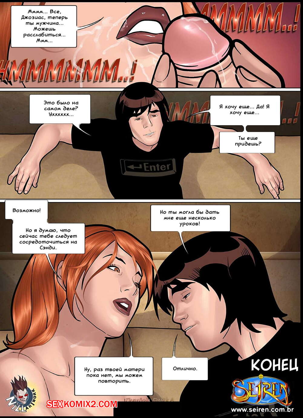 Порно комикс Спортсменка. Часть 7 Пацан помог рыжей милфе добраться до дома, за что она решила его отблагодарить. Сучка стала раздеваться и встала на колени, чтобы отсосать хуй паренька. Хорошенько возбудившись, она стала требовать, чтобы парень ее выебал.