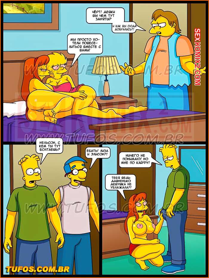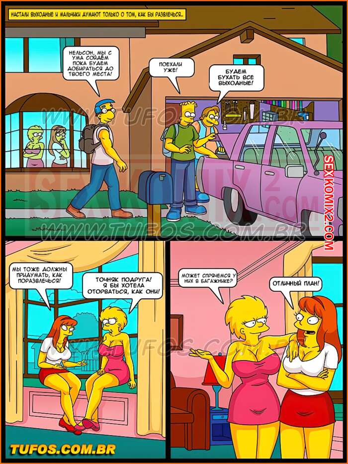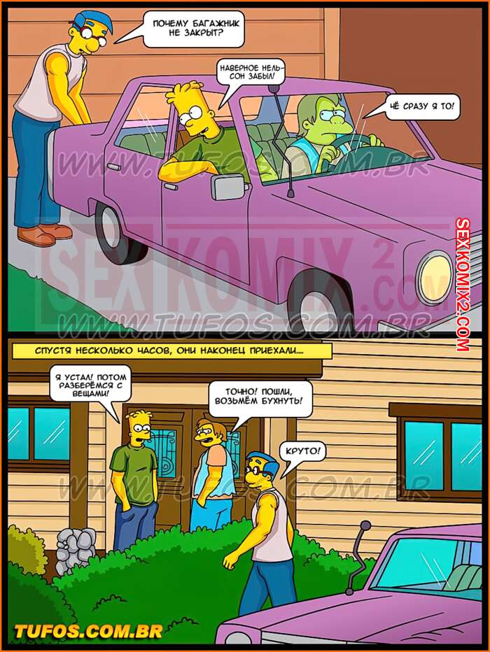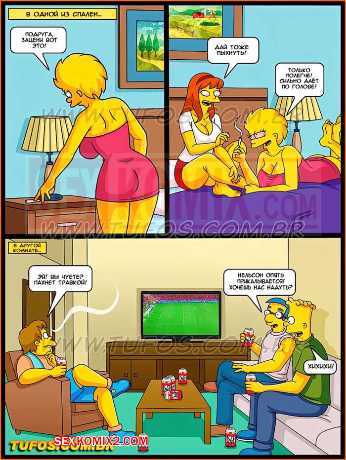 Порно комикс Симпсоны. Часть 33. Сумасшедший отрыв за городом. Студенты уехали за город и начали активно отдыхать. Парни открыли пива, а девушки пустили по кругу косячок. Они так возбудили от новых ощущений, что захотели трахаться. Парней долго уговаривать не пришлось.