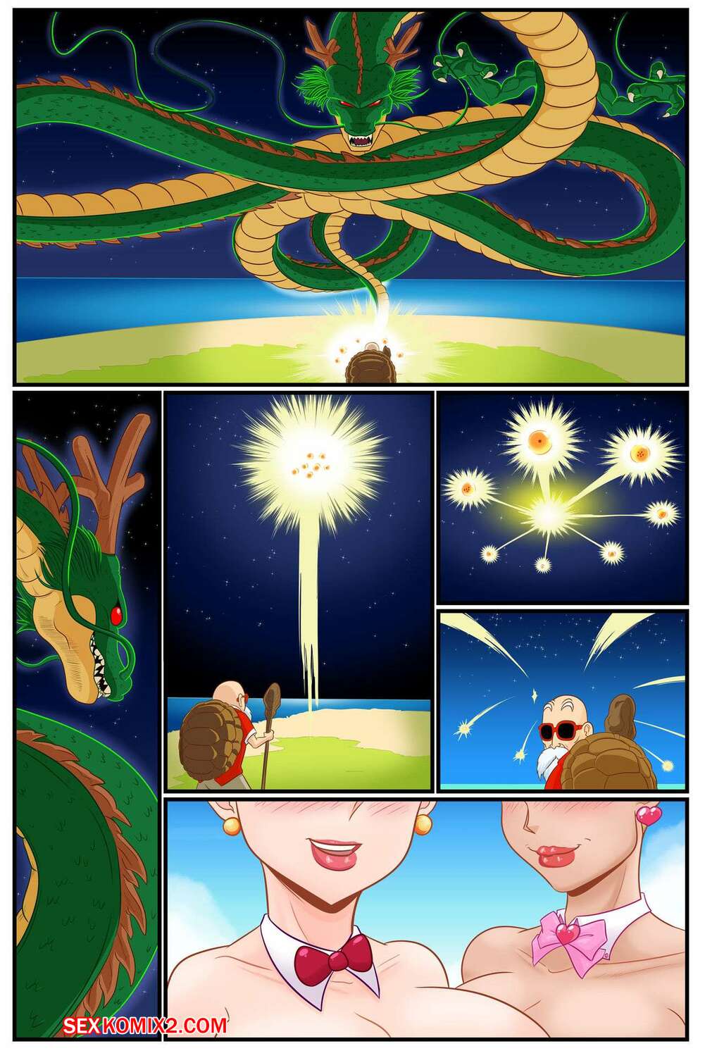 Порно комикс Dragon Bal. Желание Мастера Роши. The Wish Of Master Roshi. Kogeikun. Старый шаман вызвал огненного змея и его сила возбудила девушке, они захотели секса с ним.