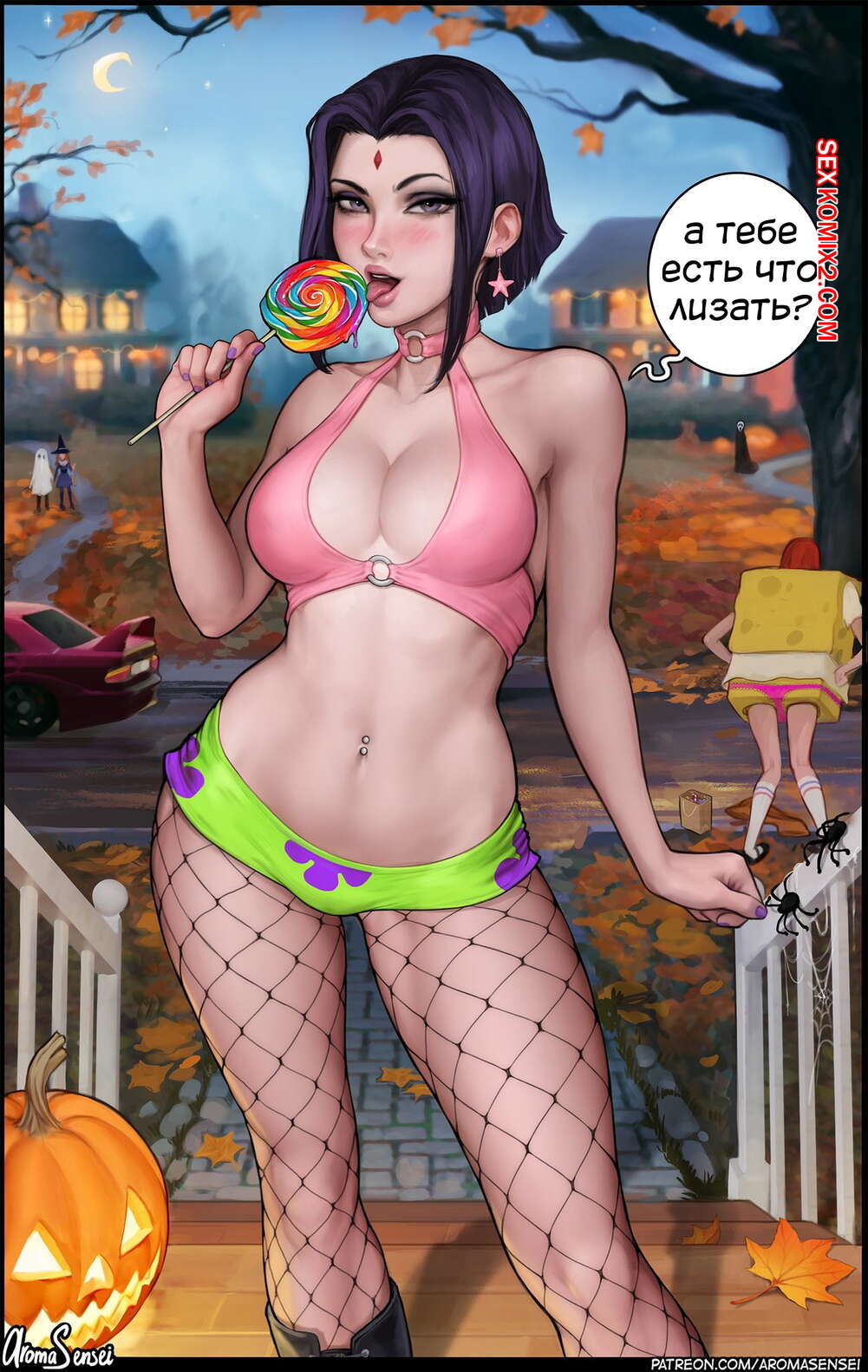 Порно комикс Хэллоуин от AromaSensei. Рейвен в костюме Патрика поедает свой последний леденец, Спанч Боб в шоке от того какая у него горячая подруга.
