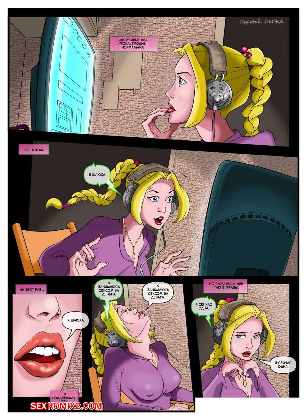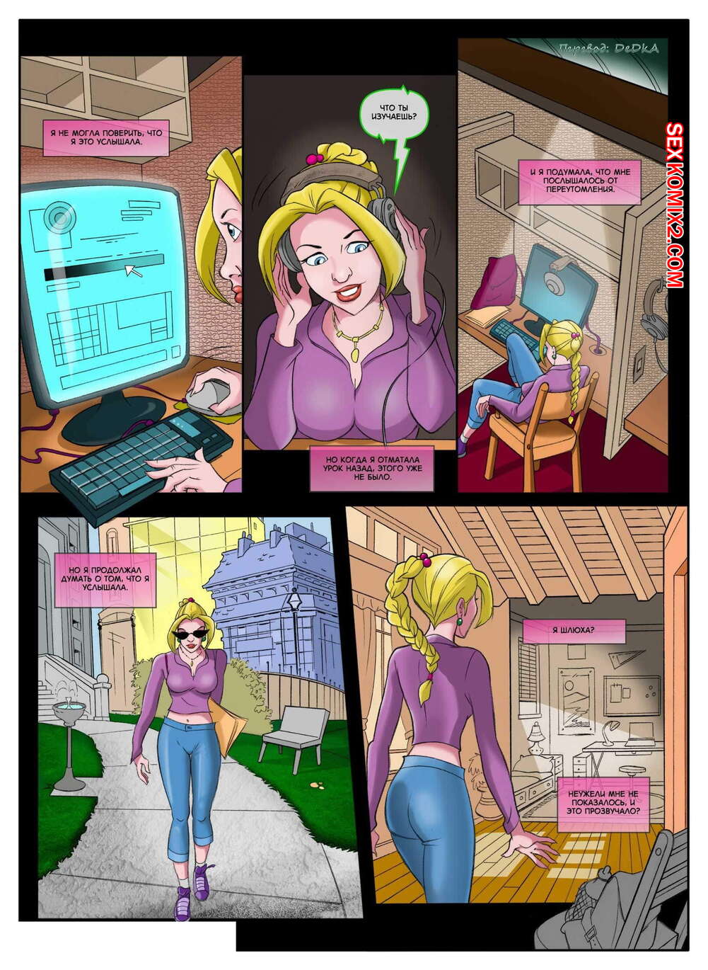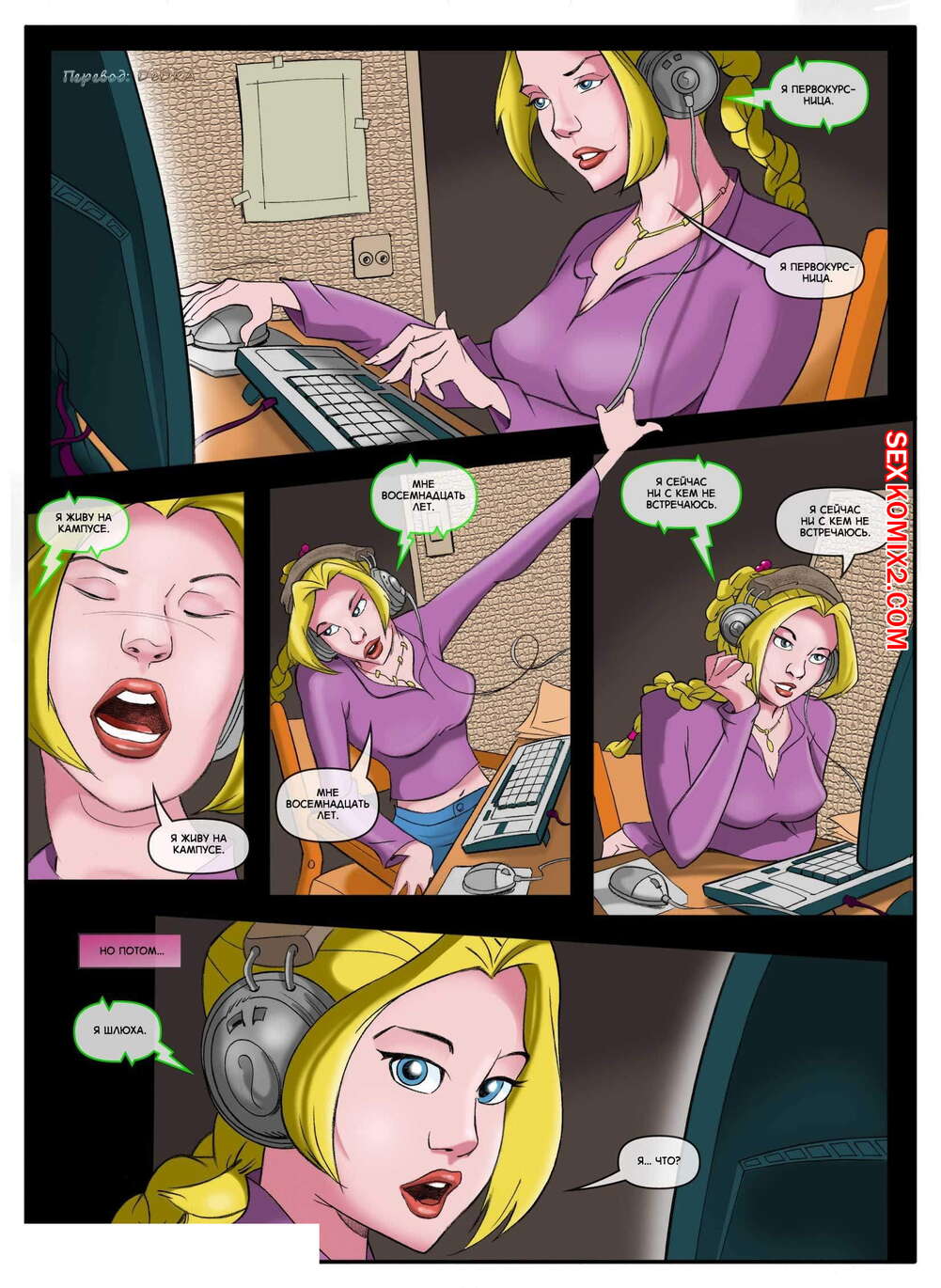 Порно комикс Мир фантазий. Часть 4 Горячая красотка блондинка снова вернулась домой со школы в очень возбужденном состоянии. Она отправилась принять душ, а затем улеглась на кровать, чтобы хорошенько поласкать свою пизденку и получить яркий оргазм.