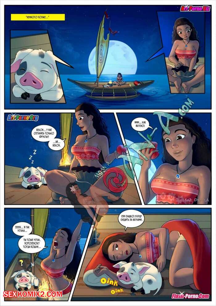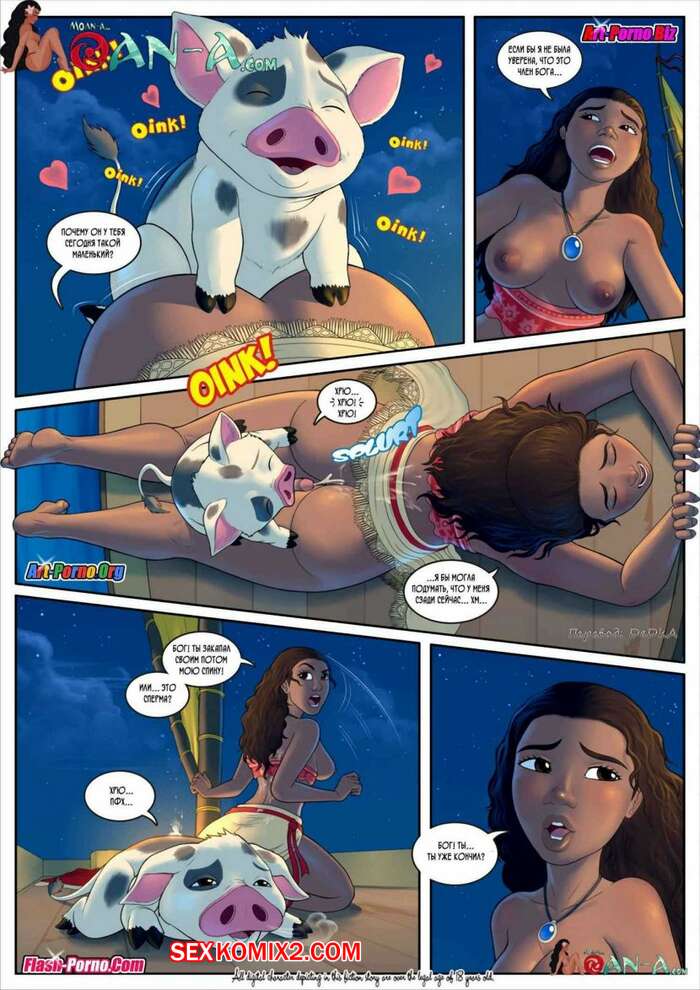 Порно комикс Моана. Остров стонов. Часть 2 Горячая красотка брюнетка отправилась в путешествие со своим питомцем. Ночью она очень возбудилась и стала ласкать свою пизденку, после чего ее поросенок отлизал ей и выебал сучку.